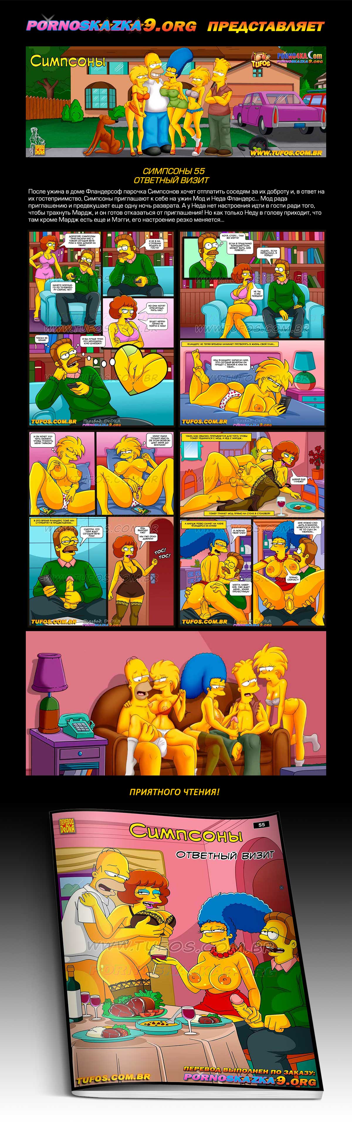 Порно комикс «Симпсоны. Часть 55. Ответный визит.» После ужина в доме Фландерсоф парочка Симпсонов хочет отплатить соседям за их доброту и, в ответ на их гостеприимство, Симпсоны приглашают к себе на ужин Мод и Неда Фландерс… Мод рада приглашению и предвкушает еще одну ночь разврата. А у Неда нет настроения идти в гости ради того, чтобы трахнуть Мардж, и он готов отказаться от приглашения! Но как только Неду в голову приходит, что там кроме Мардж есть еще и Мэгги, его настроение резко меняется…